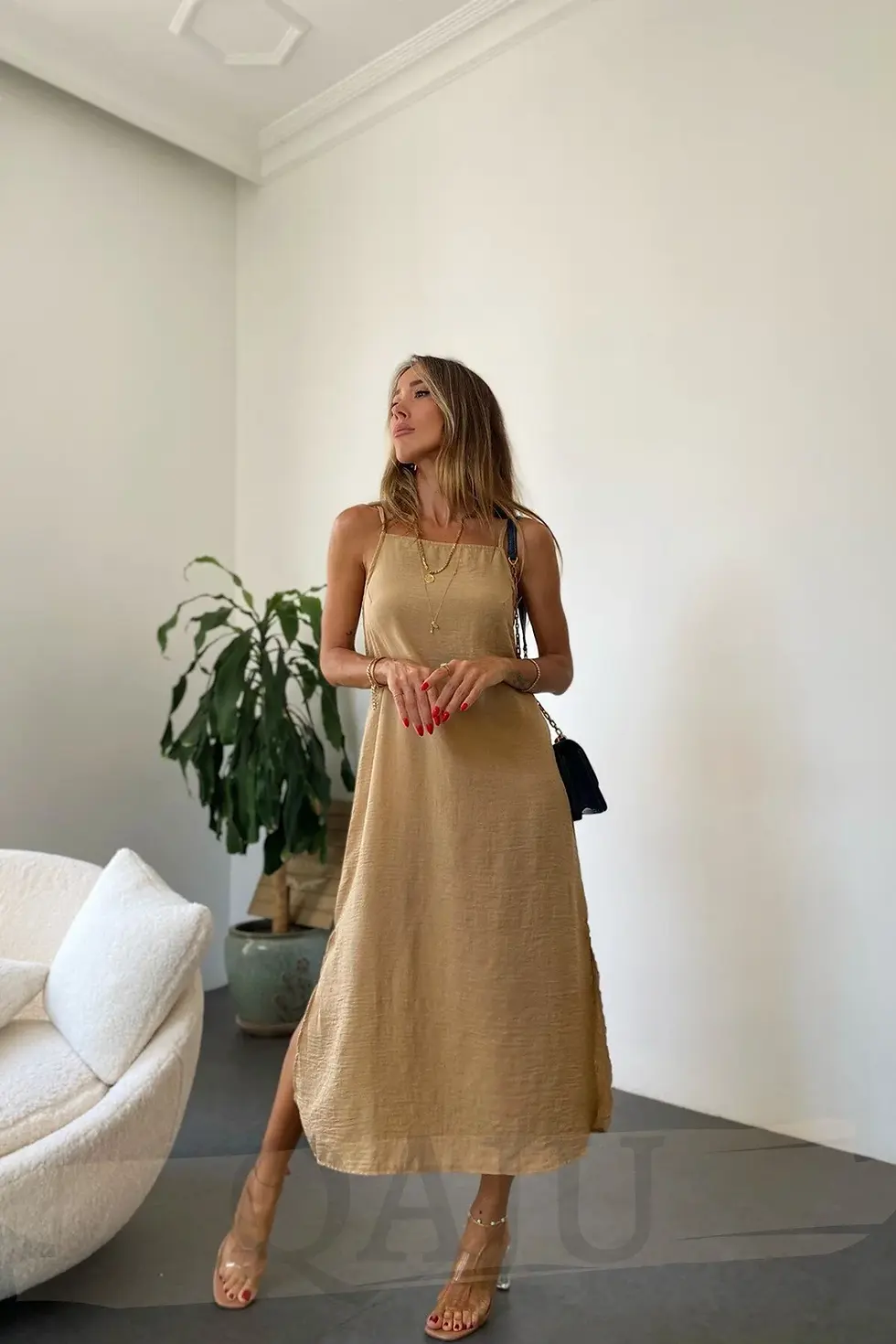 - Kemersiz tasarımı ile vücut hatlarını zarifçe sarar.